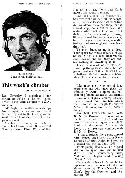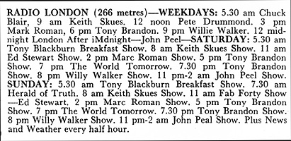| Journalist Donald Currie describes his opportunity to visit the Galaxy as "the thrill of a lifetime". Below is the Radio London schedule the magazine published for the week June 1st to 7th 1967 with an interesting spelling of John Peel's name on Sunday. Clippings courtesy of Raoul Verolleman |