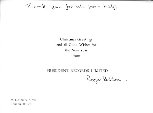 This card from Roger Bolton at President Records supported the Greater London Fund for the Blind |