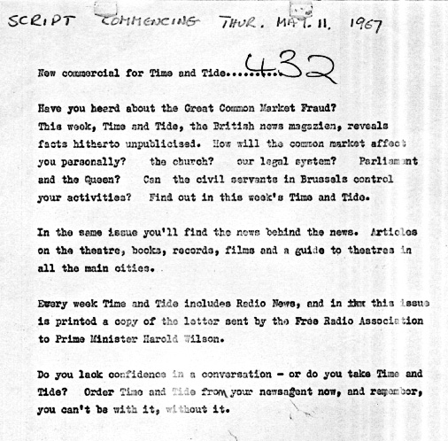 At the time of this advert being aired on Big L, Time and Tide was under the ownership of Brittain Publishing Company. Sadly, offshore radio commercials were not enough to boost flagging circulation. In 1970, publication was reduced to monthly and in 1977, it ceased for good. The population has been reduced to "lacking confidence in a conversation" ever since.
