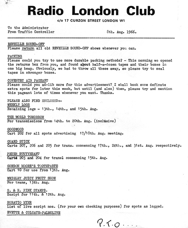 Station transmission log for advertisements and pre-recorded material dated Monday 8th August, 1966, sent from Curzon Street Traffic Controller Geoff Pearson, to on-board Administrator, Richard ('Sally') Swainson.