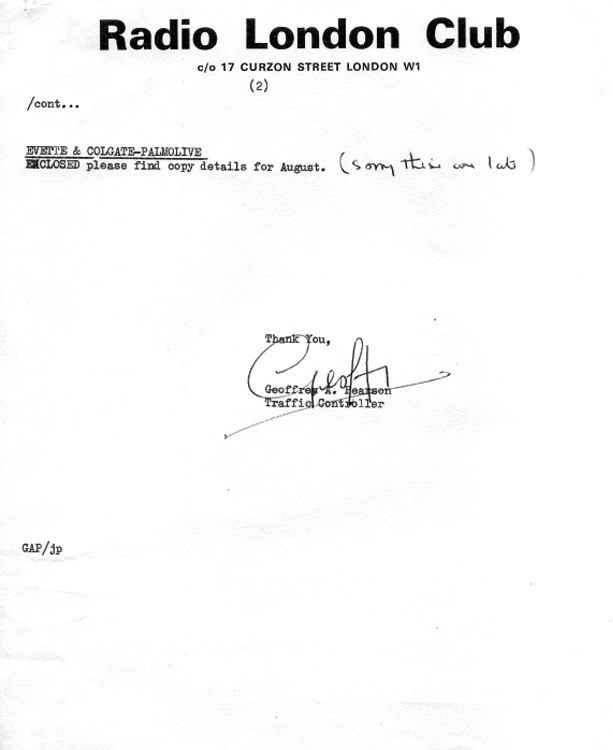 As with the previously-featured station log (see Wijnand's Memorabilia, p4) Geoff used Radio London Club headed paper. |