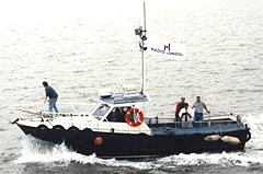 Soon after hearing this historical event, Fluff and I began walking the full three-quarter-mile length of Walton pier for the first time. We introduced ourselves to Abbie and Caroline at the Radio London shop, which was situated about half way down the seemingly endless stretch of planks, and were despatched to the distant reaches of said endless stretch to await the arrival of the tender, the Lady Gwen. It was here that we made our first acquaintance of news supremo, Tom Collins, otherwise known as the Sea Poodle, who was returning to the ship after a night's shore leave. Tom had apparently turned down the offer of using the same method of transport as Ray to reach the Yeoman Rose. We peered down at the jetty below, where the dinghy was moored, scarcely moving in the calm water. Glen Harvey, the son of Chris, the Lady Gwen's owner, and a lifeboatman to boot, insisted that the inflatable was quite seaworthy. Could the fact that the vessel had such an awful lot of water inside it, and such an enormous bail-out bucket on board have slightly discouraged the station's intrepid Sea Poodle, we wondered?