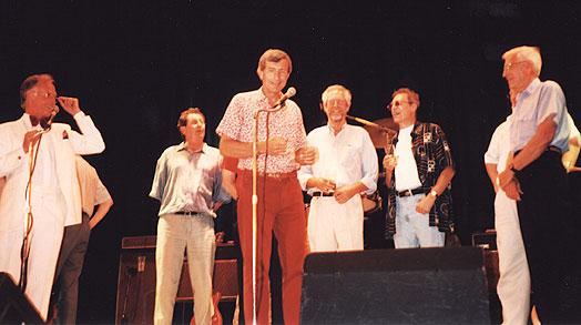 On stage with former Big L DJs (l to r) Mark Roman, Dave Cash, Dave Hawkins, Duncan Johnson and Tommy Vance, Summer of Love Party, 1997 |