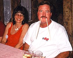 Top: Radio London supporter Per Alarud from Sweden (left) enjoying a pint with Alan Hardy. Bottom: A profusion of t-shirts. |