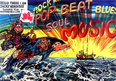 "The 'crew' on deck trying to get the transmitter working. (l to r) Andy Archer (partly hidden), Roger Day, Duncan Johnson, Peter Chicago, ?, captain Onnes, Koos van Duin, Dave Hawkins, Dirk Adrichem. The 2 people sitting remain unidentified. The Dutch engineer with the black beard, Koos van Duin, was driving the Mebo II during the crossing, when everyone else was in the green room." Ex- Radio London engineers Russell Tollerfield and Dave Hawkins were visiting the Mebo to fix transmitter problems, as reported here. |