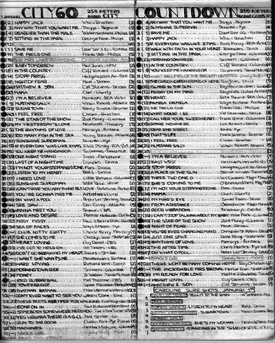 It's a great pity the chart compiler didn't include his (or her) name, but for now, we shall refer to the notebook as 'Monty's Diary' – Monty being the manufacturer's brand name. There are one or two loose sheets of paper inside the diary, one of which has turned out to be a letter dated 26th June 67. It is addressed 'Dear Peter' (which we guess must be the compiler's first name) and signed 'Roger', who lived at 36 Victoria Park, Cambridge. If Roger reads this and can identify the diary compiler's full name and where he lived, (we believe it was the Netherlands) it would be very useful. The charts are fascinating and very neatly written, with the record label noted beside each track. Very many thanks to Hans for being kind enough to send us 'Monty's Diary' and to Fab Alan Field for checking the Fab Forty listings against our existing ones. Alan says, "The correlations between Monty's work and mine and Brian Long's are generally excellent. Plus, I think you can tell from the style and layout that his lists are as authentic and accurate as anybody's could be. The new tracks are mainly additional climbers that he must have heard played during the week. I'm quite happy to add them." Other chart information from it will be added to the Radio London site as and when possible. (Right) An example of charts from Monty's Diary |